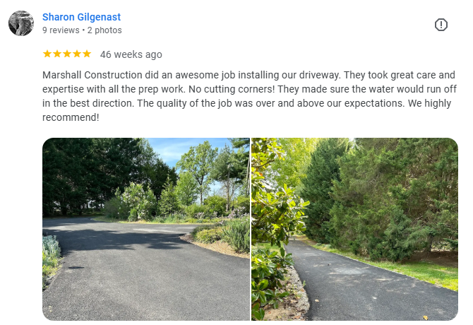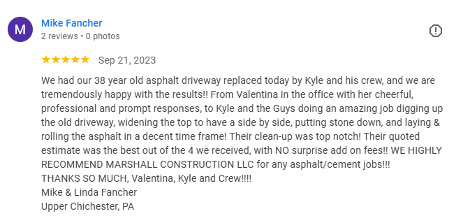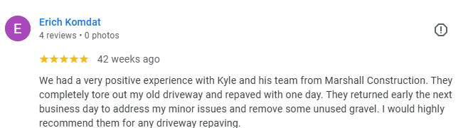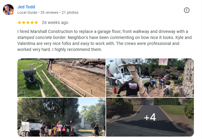 Marshall Construction LLC: Your vision, our expertise! For over 20 years, this family-owned business has been delivering and exceeding expectations in concrete and asphalt solutions. We are your trusted partners, committed to quality, customer satisfaction, and bringing your dreams to life! From residential to commercial projects, we use state-of-the-art equipment and skilled workmanship to ensure precision and care. Get a FREE estimate today and experience the difference with The Driveway Experts– unmatched quality, competitive pricing, and a commitment to excellence that stands the test of time! Let's build something amazing together!